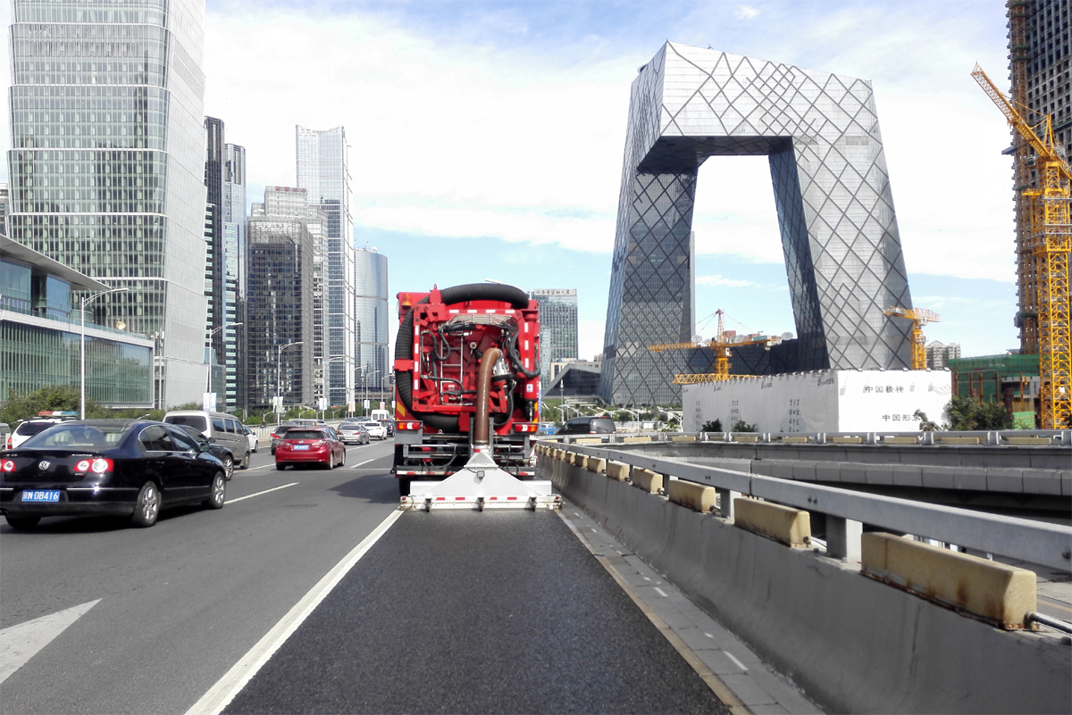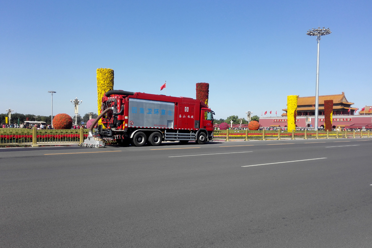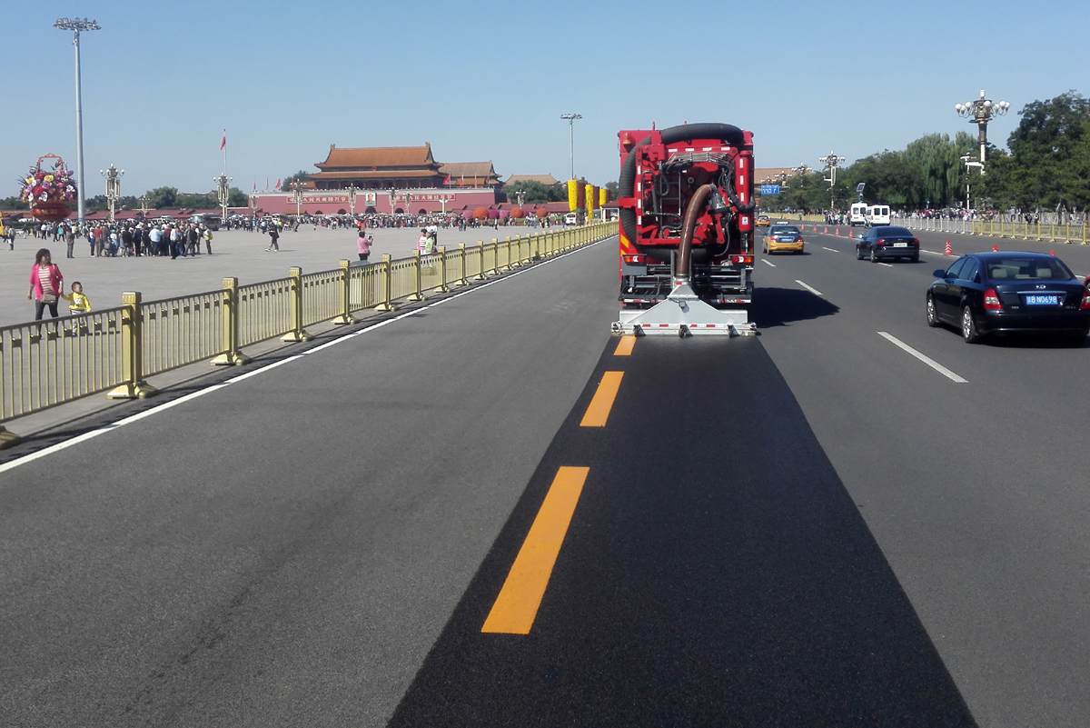 北京市天安門廣場、二環(huán)線、三環(huán)線、長安街等主干道路面的深度清潔施工,經(jīng)過清理的路面顯露出了路面鋪設(shè)之初的本色,縫隙可見,標(biāo)線清晰,與只經(jīng)過普通機(jī)掃的路面形成鮮明對比,此次大范圍清潔之后,使得城區(qū)主干道更干凈,還北京一片藍(lán)天。
