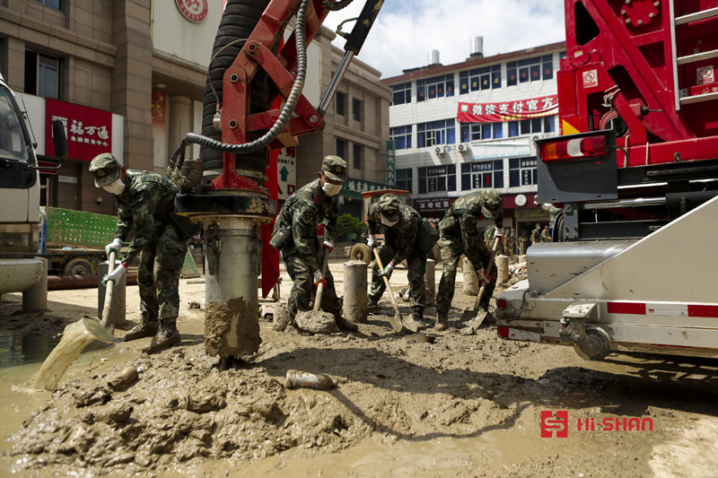 武警8710部隊(duì)官兵承擔(dān)了最為艱難的農(nóng)貿(mào)市場道路清淤、消殺防疫的攻堅(jiān)戰(zhàn)。為提高救援施工效率,武警部隊(duì)與海山機(jī)械迅速動(dòng)員,火速趕赴100多公里以外的災(zāi)區(qū)。