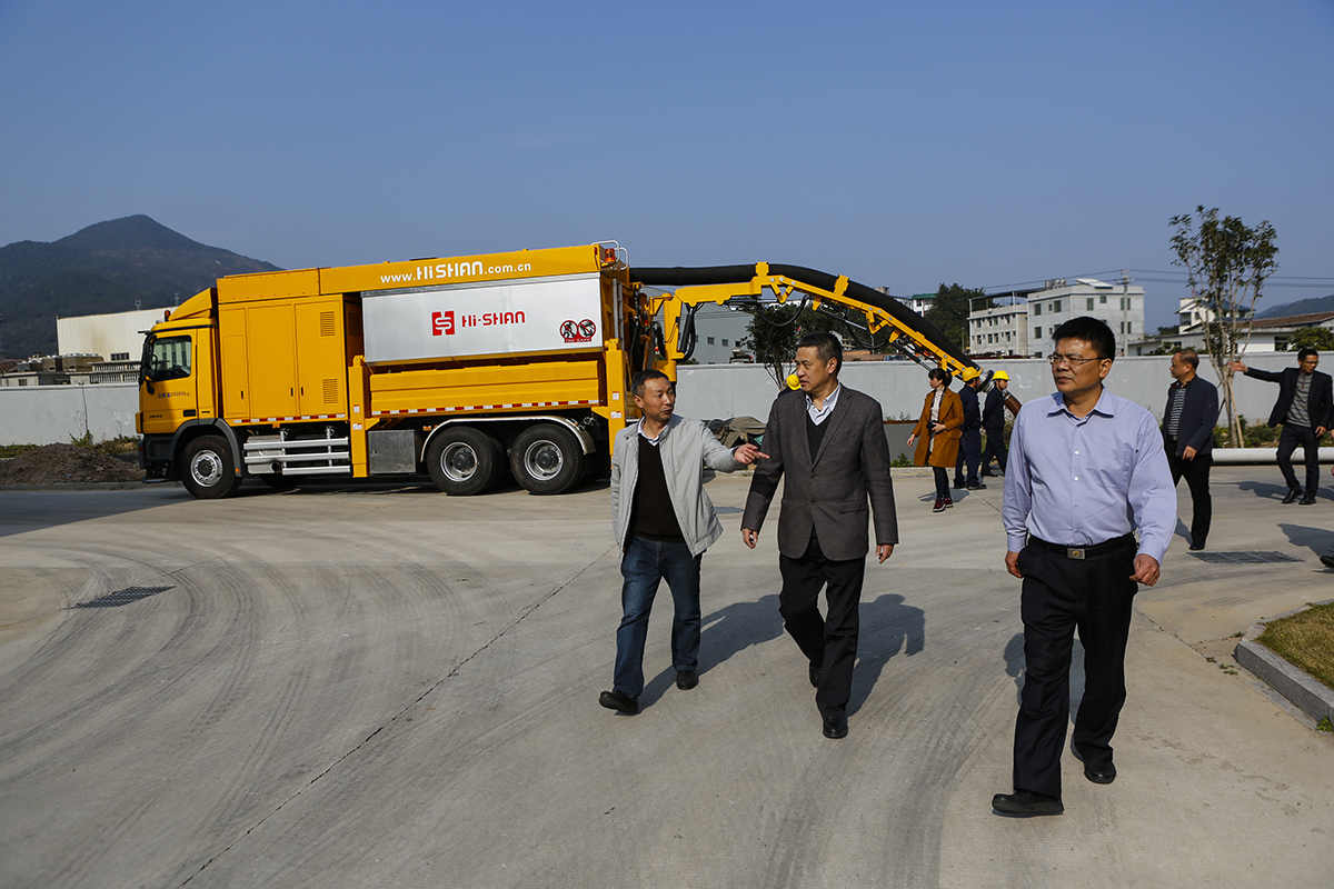 嚴(yán)效東一行在海山常務(wù)副總經(jīng)理張秋先陪同下,觀看了海山污染清除車、步履式施工裝備、非破壞性挖掘抽吸車、真空垃圾收集系統(tǒng)等產(chǎn)品演示。嚴(yán)效東在海山生產(chǎn)車間,詳細(xì)聽取了張秋先對海山幾大系列產(chǎn)品的制造與裝配過程的介紹。
